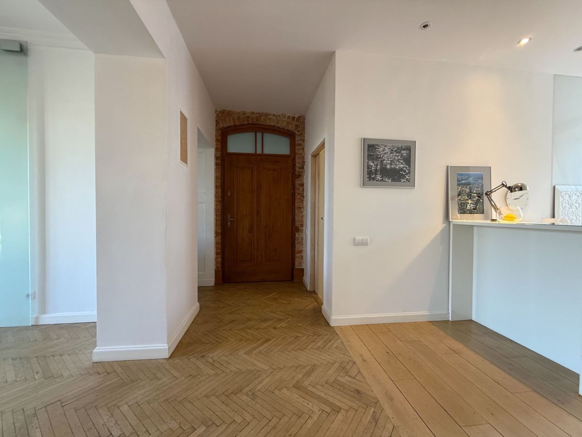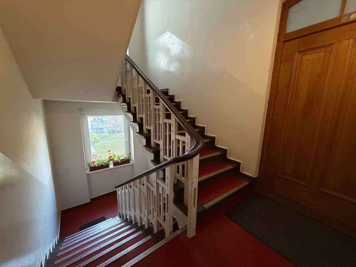 - Oryginalna stolarka drzwiowa i okienna po renowacji, wzbogacona o nowoczesne akcenty wnętrza.