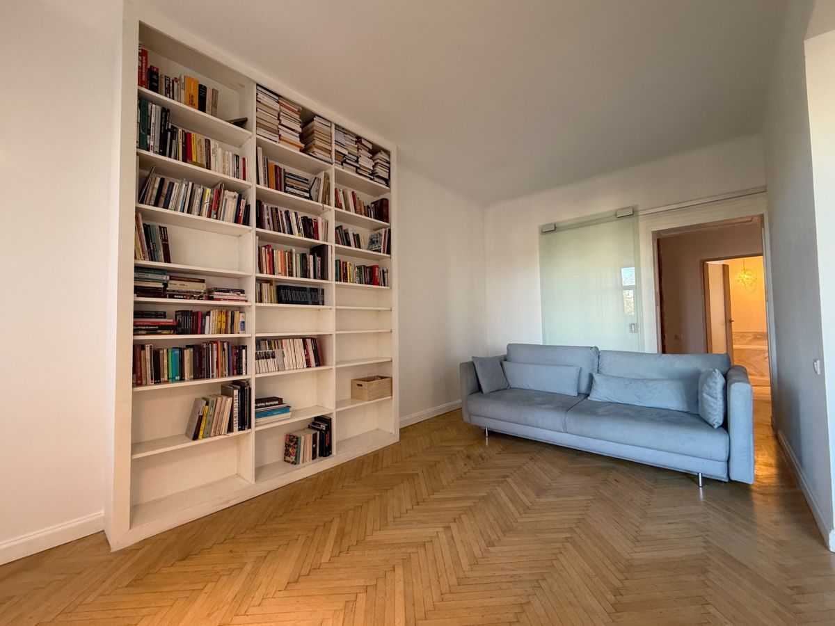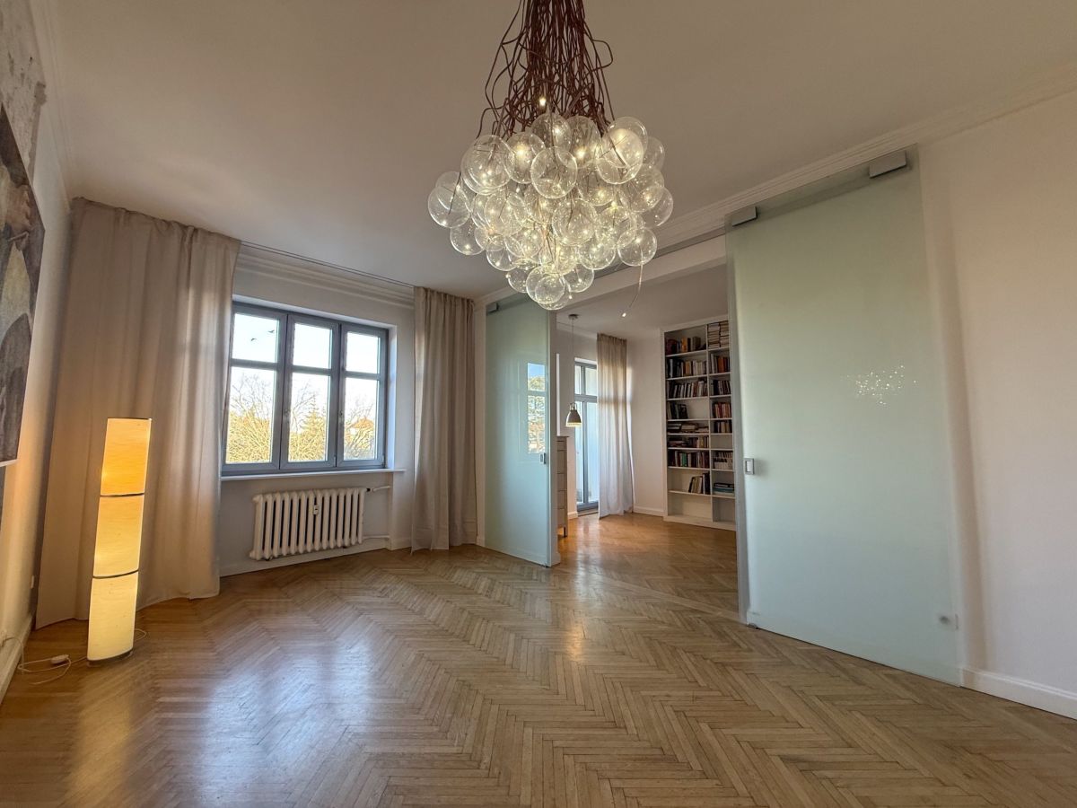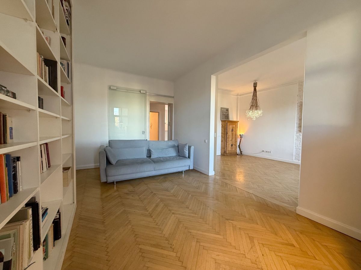 - Trzy jasne pokoje z dużymi oknami i oryginalnym dębowym parkietem ułożonym w jodełkę.