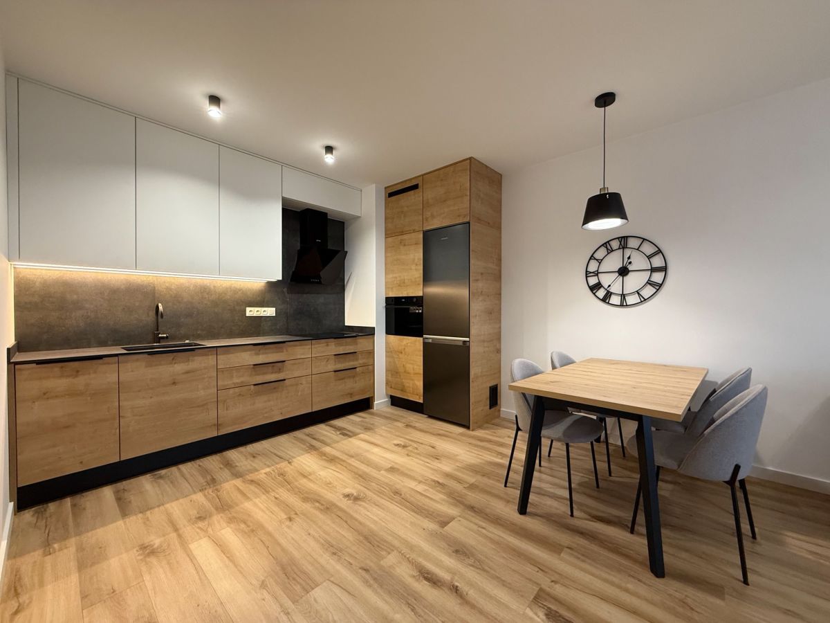 - Kuchnia w zabudowie z pełnym AGD: piekarnik z funkcją mikrofalówki (combi), duża lodówka, zmywarka, płyta indukcyjna, okap