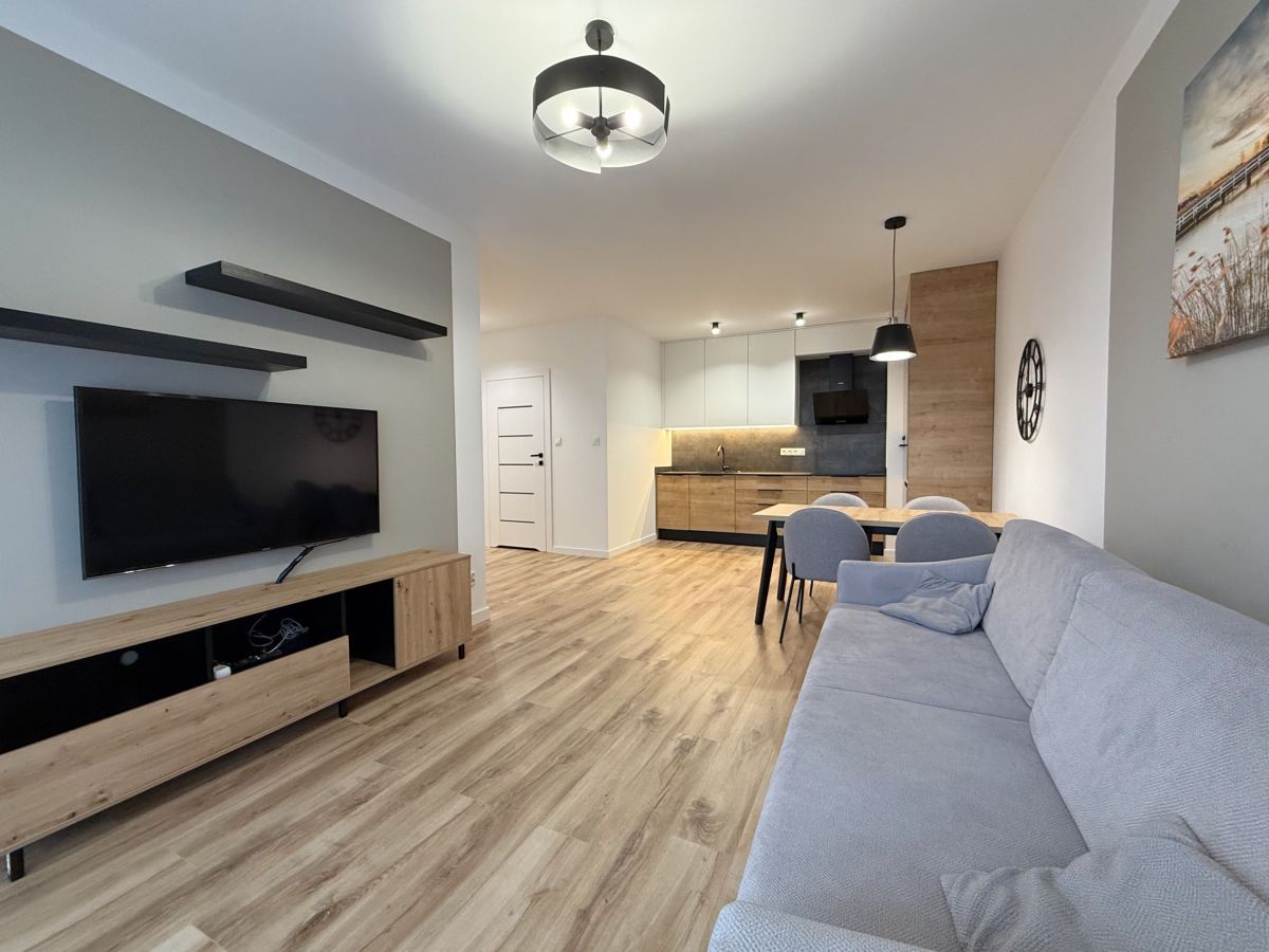 - Salon z aneksem kuchennym (meblościanka z TV, wygodna rozkładana sofa z pojemnikiem na pościel, stół z czterema krzesłami)