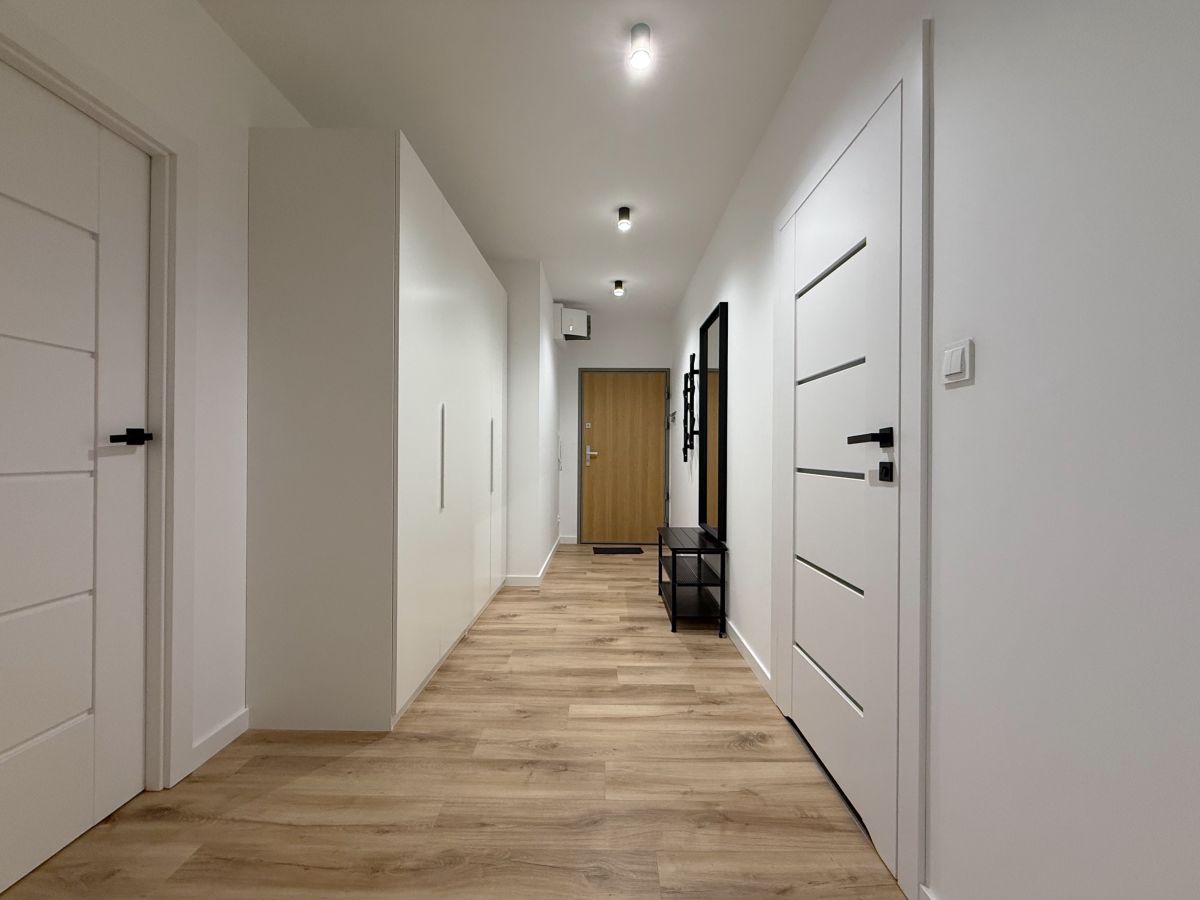 - Korytarz z szafą i dużym lustrem
