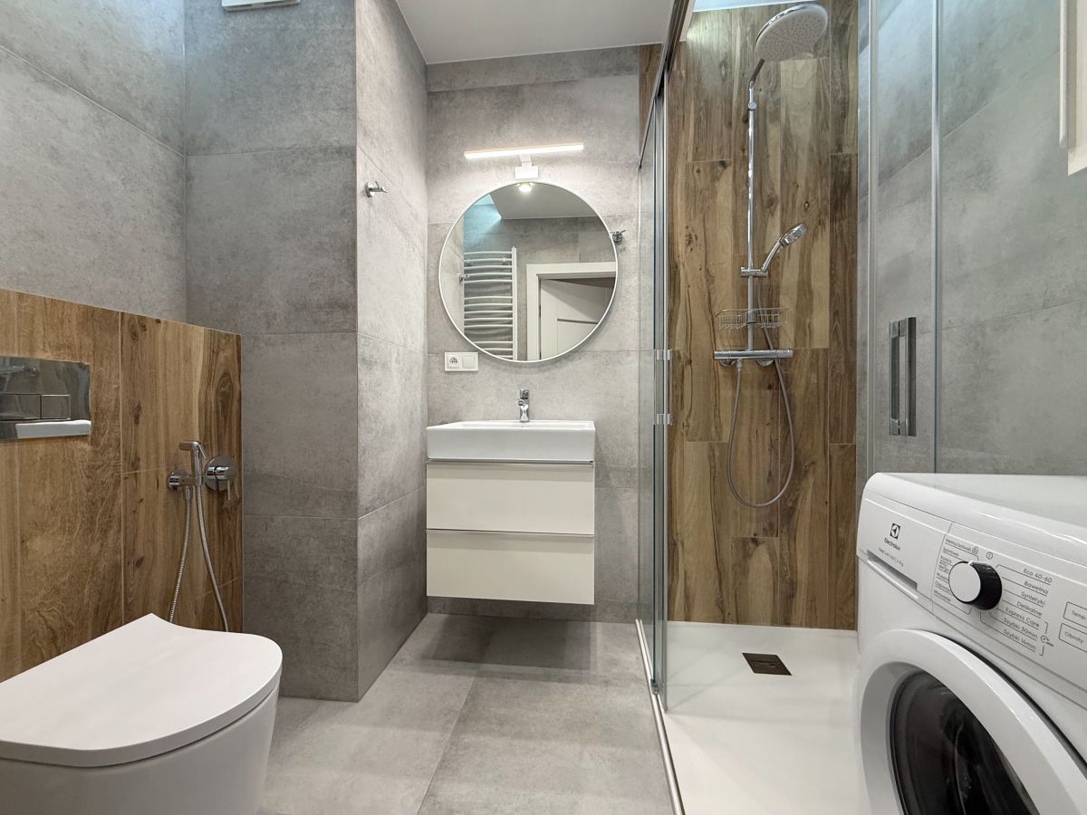 - Łazienka z prysznicem, umywalką z szafką, WC oraz dodatkową szafką