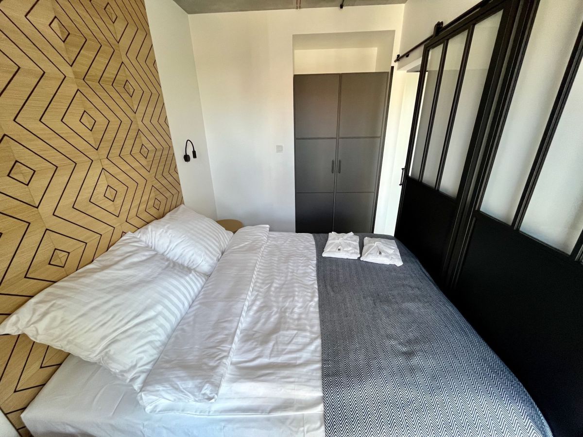 Apartament na czwartym piętrze (budynek V piętrowy z 2 windami) o powierzchni 28,55 m² składa się z salonu z aneksem kuchennym (klimatyzacja) z wyjściem na ustawny balkon oraz sypialni z loftowymi drzwiami.
