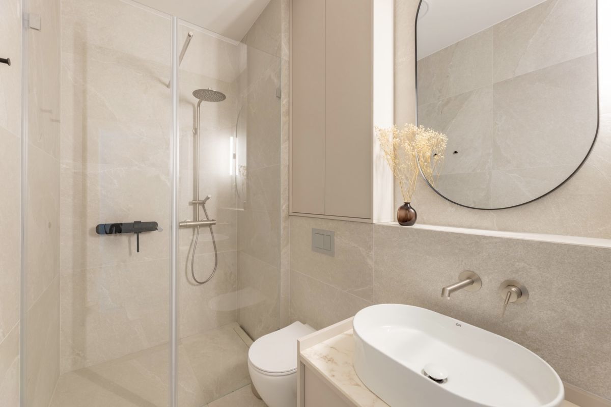 - Łazienka z kabiną prysznicową, pralką i dużą szafką pod umywalką