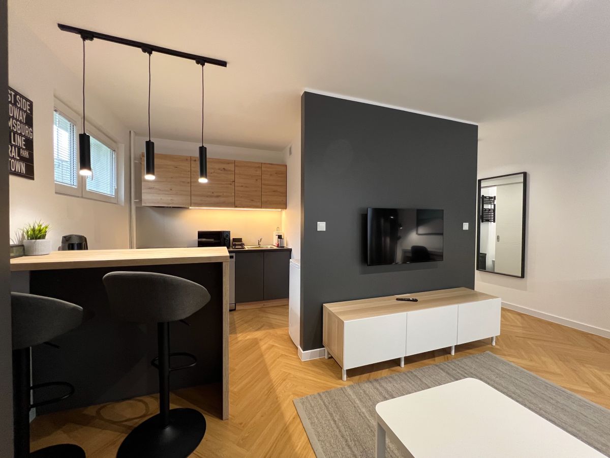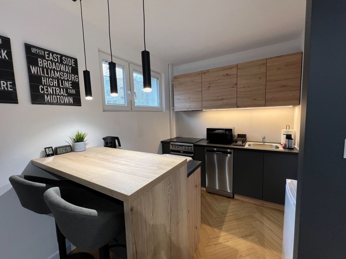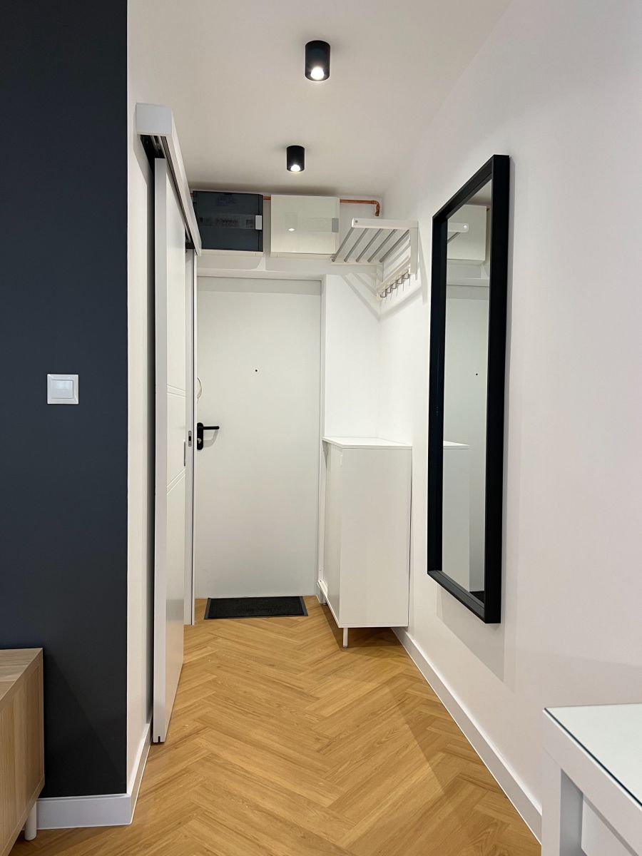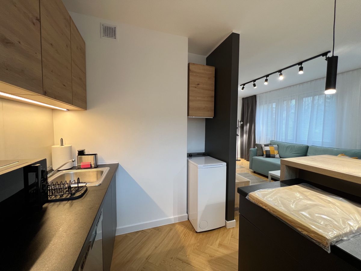 Kuchnia w pełni wyposażona w sprzęt AGD: lodówkę, zmywarkę, piekarnik, płytę indukcyjną oraz okap. Dodatkowo mieszkanie wyposażone jest we wszystkie niezbędne sprzęty: czajnik, suszarka na pranie, odkurzacz itp.