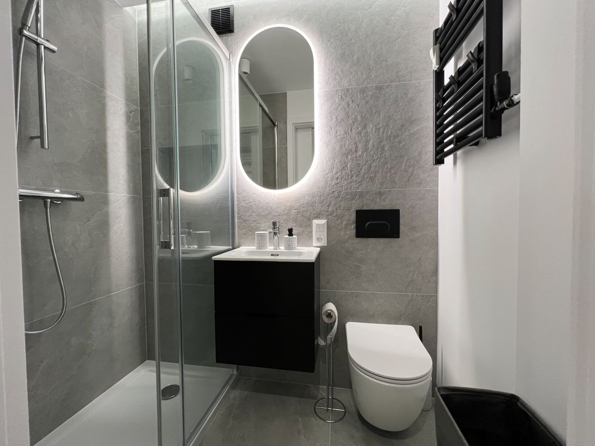 - Stylowa łazienka z prysznicem oraz dużym lustrem;